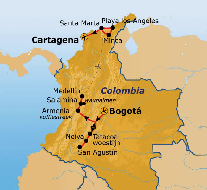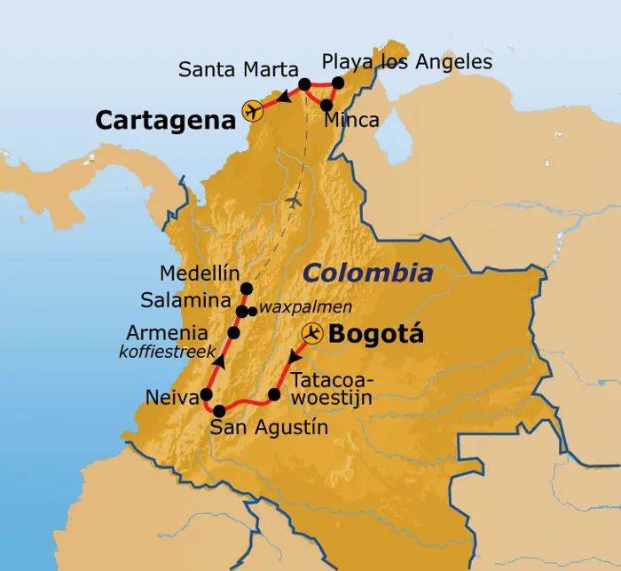 Reizen in een kleurrijk en levendig land? Si! Colombia is een divers land waar zowel natuur- als cultuurliefhebbers aan hun trekken komen. Laat je overweldigen door de vele contrasten: woestijn, historische steden, kleurrijke dorpjes, de koffiestreek, metershoge waxpalmen, natuurparken en Caribische kust. Typische Colombiaanse activiteiten vergezellen ons de hele reis: speel een potje tejo, proef aguardiente tijdens de kroegentocht, tube relaxt van de rivier en dans de salsa. Vamos!