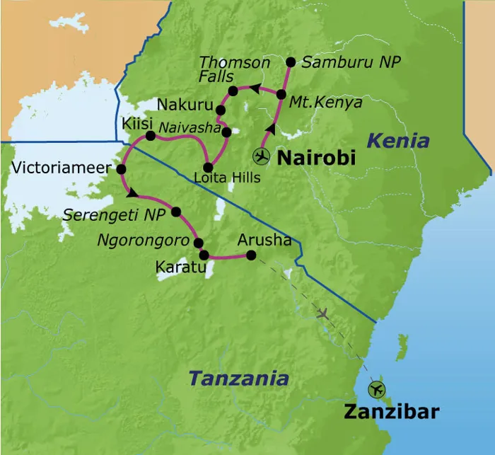Tijdens deze familiereis door Kenia, Tanzania en Zanzibar reis je langs de mooiste en meest afwisselende landschappen van Afrika. Je gaat op safari in wildrijke natuurparken zoals de Serengeti, Samburu en Nakuru. Hier zie je zebra's, giraffen, gnoes en flamingo's, en misschien ook wel leeuwen! We bezoeken de Ngorongoro-krater, waar hyena's, nijlpaarden, neushoorns en luipaarden in afzondering leven. Daarnaast heb je de kans om de Samburu- en Maasai-stammen te ontmoeten tijdens ons bezoek aan Loita Hills, bekend van het programma 'Floortje naar het einde van de wereld'. Tijdens een dorpswandeling in Mto wa Mbu maak je kennis met het lokale leven en lunch je bij de mensen thuis. We eindigen op het exotische eiland Zanzibar, waar je kunt duiken of snorkelen.
