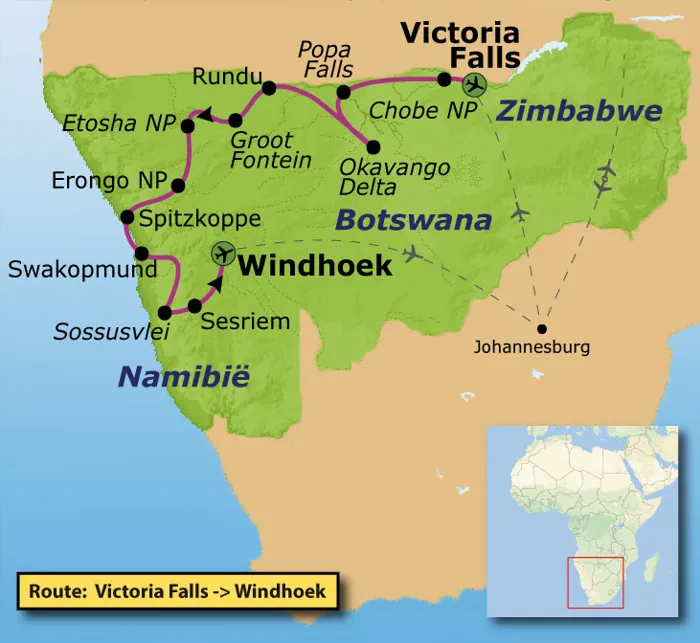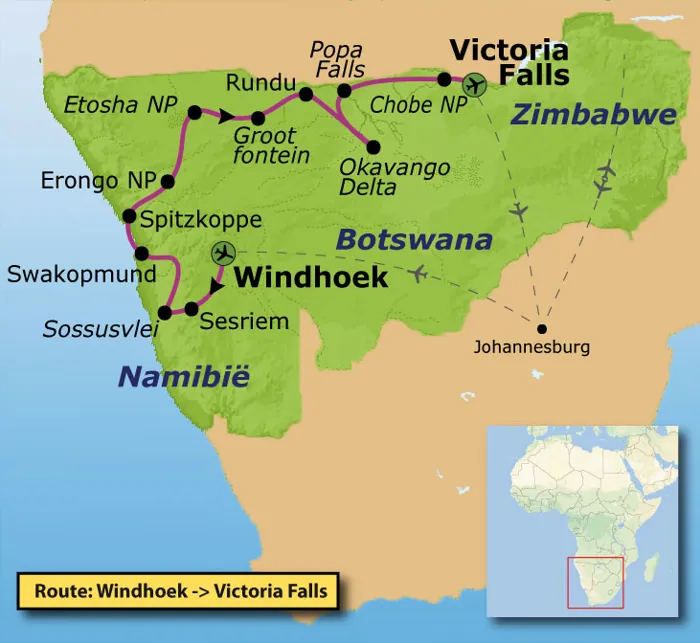 Vandaag begint je reis naar Zuidelijk Afrika met een vlucht naar Namibië. Afhankelijk van het vluchtschema vlieg je via Johannesburg en verblijf je daar een nacht. Bij aankomst in Johannesburg word je opgewacht door een vertegenwoordiger van het hotel. De volgende dag vlieg je door naar Windhoek, waar de reisbegeleider je verwelkomt. Als je via Europa vliegt, overnacht je in het vliegtuig en kom je de volgende ochtend aan in Windhoek. Voor de juiste vluchtgegevens verwijzen wij naar het vluchtschema.