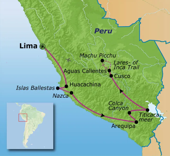 Tijdens deze familiereis door Peru reis je door het land van de Inca's, een land in raadselen gehuld. We gaan op zoek naar de bron van de legendes. We maken een boottocht naar eilandjes voor de kust van Pisco, waar tientallen zeeleeuwen, pelikanen en pinguïns leven. Op de uitgestrekte hoogvlaktes in de Andes kom je kuddes lama's tegen en zie je misschien wel de gigantische condor vliegen. Op een eiland in het Titicacameer overnacht je bij een traditionele Iokale familie. Een vierdaagse optionele trektocht door het Andesgebergte brengt je naar Machu Picchu, de mysterieuze stad van de Inca's. Je kunt er ook voor kiezen om vanuit Cuzco of Urubamba diverse excursies te maken.