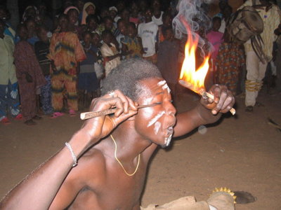 Hierna rijden we verder naar Sokodé, de tweede stad van Togo, waar we ’s avonds getuige zijn van een indrukwekkende vuurdans. In het midden van het dorp verlicht een groot vuur de gezichten van de deelnemers. Op het ritme van opzwepende trommels dansen ze rond de vlammen, tot sommigen in trance raken en in de gloeiende kolen springen. Ze raken het vuur aan, wrijven brandende stukken over hun huid en nemen zelfs smeulende kolen in hun mond — zonder zich te branden.
