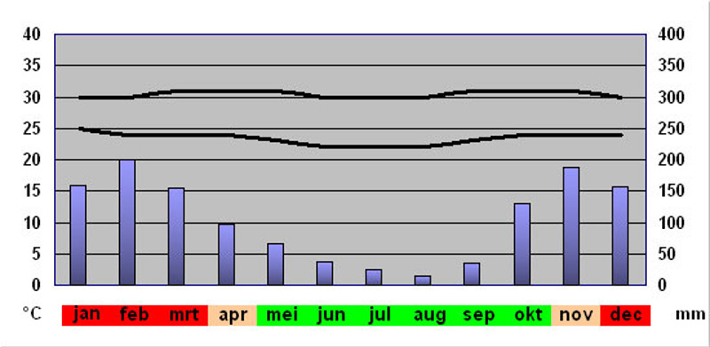 Indonesië heeft door zijn ligging als 'gordel van smaragd' rond de evenaar, het hele jaar door een vrijwel constante temperatuur van ongeveer 30 graden. Alleen in de hoger gelegen berggebieden kan het 's nachts afkoelen. De enige variatie in het weerpatroon brengt de regentijd. Deze begint in Sumatra ruwweg rond november en eindigt rond mei in het oosten van de archipel. Overigens kun je het hele jaar door, ook in de zogenaamde droge tijd, regenbuien verwachten. De beste tijd om naar de Kleine Sunda Eilanden te reizen is in de droge tijd (van mei tot en met oktober) in verband met de gesteldheid van de zee. In deze periode is het overdag warm en droog en zijn de avonden aangenaam koel. In de hooggelegen plaatsen (Detusoko, Bajawa en tijdens de looptocht) kan het in deze maanden ’s avonds fris zijn.