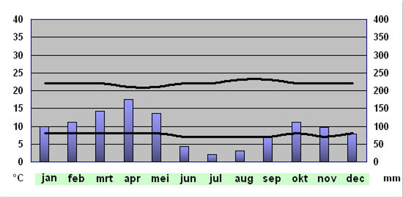 Oriente -tropisch warm en vochtig gedurende het gehele jaar -juli en augustus natte periode
