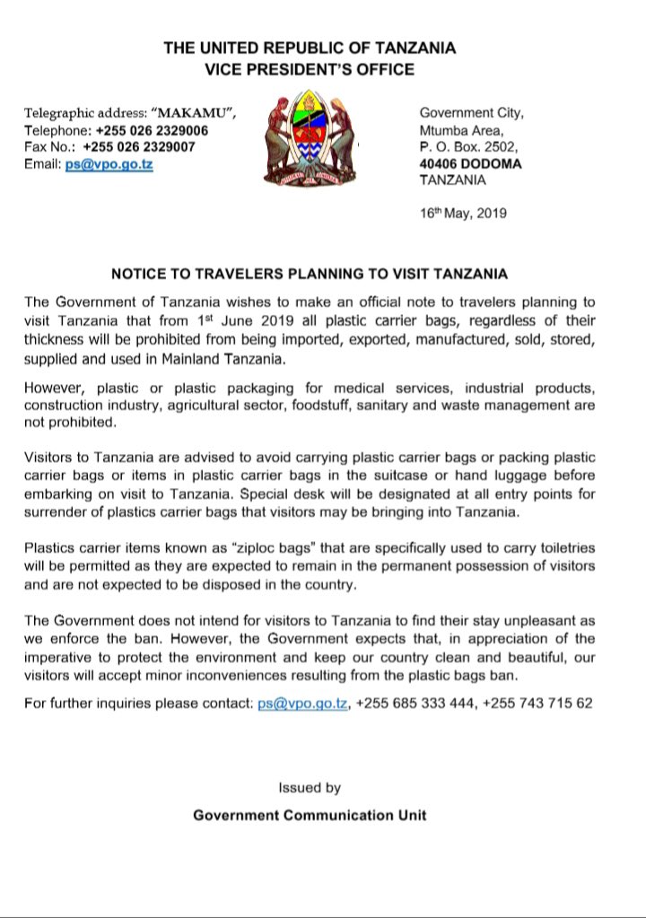 De regering van Tanzania heeft daarom besloten om het gebruik van plastic tasjes (ongeacht hun dikte en grootte) per 1 juni 2019 te verbieden. Ga je binnenkort naar Tanzania? Houd er dan rekening mee dat er geen plastic in je bagage zit bij binnenkomst van het land. Deze maatregel geldt voor zowel handbagage als ruimbagage. Een zogenaamd klein "ziplock"-zakje voor kleine toiletartikelen in de handbagage is een uitzondering op deze regel.