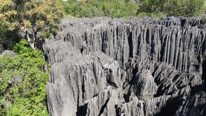 Op dag 9 van de reis maakten we een tocht met een pirogue, een traditionele houten kano, over de Manambolo-rivier. We varen door het Tsingy-gebied en bezoeken twee grotten. Daarna gaan we het Tsingy de Bemaraha National Park bezoeken. Dat is een karstlandschap van kalkgesteente. We maken een wandeling tussen en over de rotsen en spleten. Best een uitdaging, maar bijzonder om te zien.