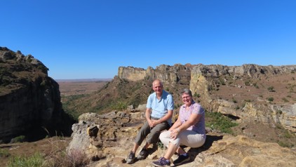 Op dag 18 gingen we een wandeling maken door het Isalo Nationaal Park, de "Grand Canyon van Madagascar". Het is een immens groot bergmassief van zandsteenformaties, diepe kloven, steile pieken, kleine riviertjes en heldere meertjes. We zien kameleons, sifaka’s, sprinkhanen, gekko’s en veel ringstaartmaki’s. Prachtig zo met op de achtergrond de rotswanden. Het was een pittige, uitdagende wandeling.