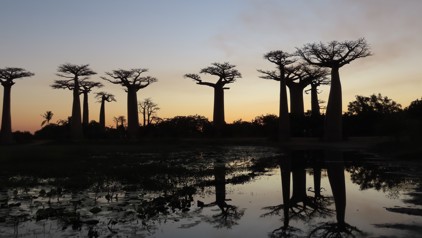Aan het einde van dag 7 gingen we met jeeps naar de Allée des Baobabs voor de zonsondergang. Het pad waar de Baobabs staan is van zand en nog geen 300 meter lang, maar toch is het de bekendste weg in Madagascar. Wij waren er met de zonsondergang en dat zag er magisch uit. De schaduwen spiegelden in een vijver met lelies, dus erg fotogeniek.