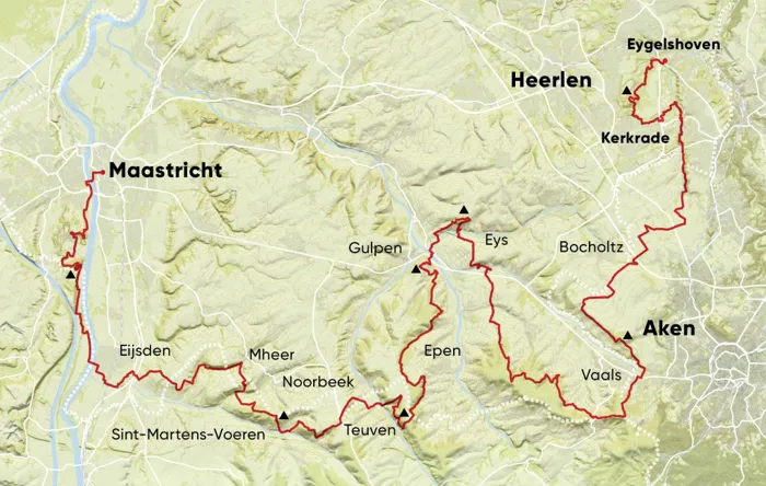Kenmerkend voor deze dag zijn de vele kruisbeelden langs de weg en de Jezusbeelden in bomen, die je herinneren aan het katholieke karakter van de streek. Aan het einde van de etappe wacht ons nog een laatste klim over de Eyserberg, waarna we afdalen naar het sfeervolle dorp Gulpen, waar we overnachten.